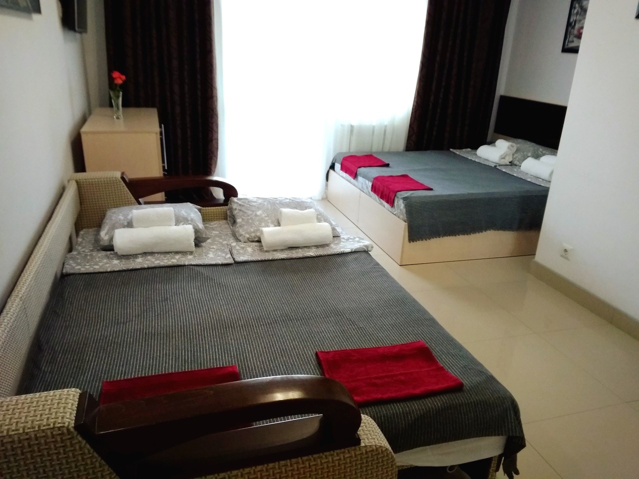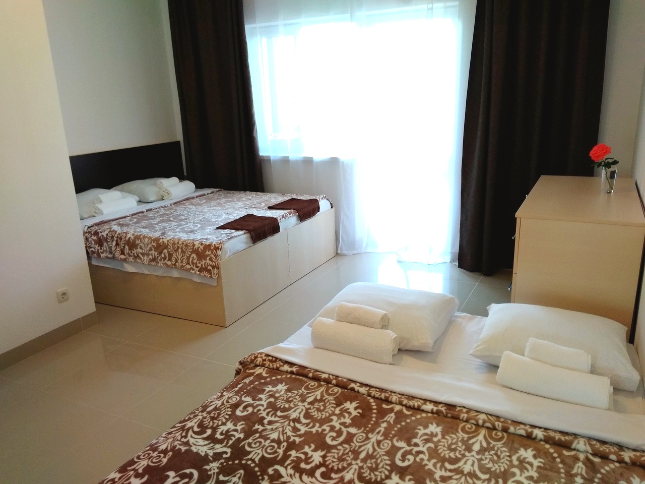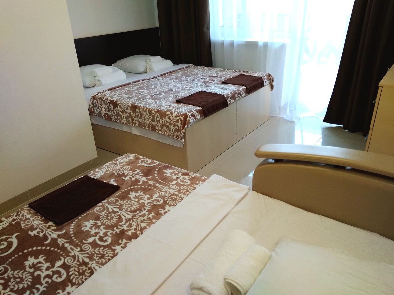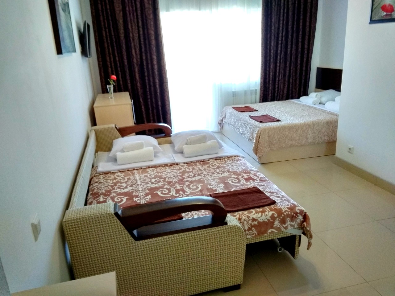 Поездом до ж/д вокзала г. Симферополь, далее на рейсовом маршрутном такси до автостанции «Феодосия», далее на автобусе 4д до остановки «Приморский-2», далее 1300 м до отеля.